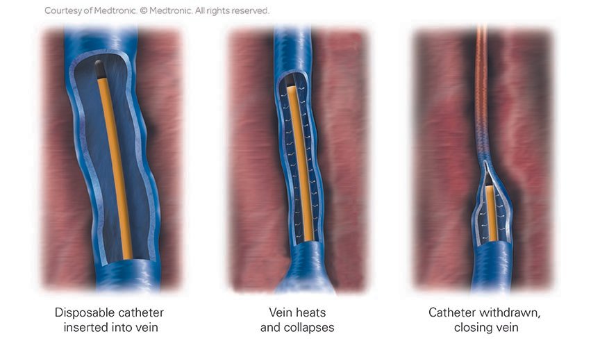 Endovenous Thermal Ablation – is a minimally invasive treatment that involves the insertion of a thin, flexible tube called a catheter into a diseased vein to seal it shut using heat. Over time the treated vein shrinks and is absorbed by the body. Compared with surgical options, endovenous ablation results in less pain and quicker recovery time.